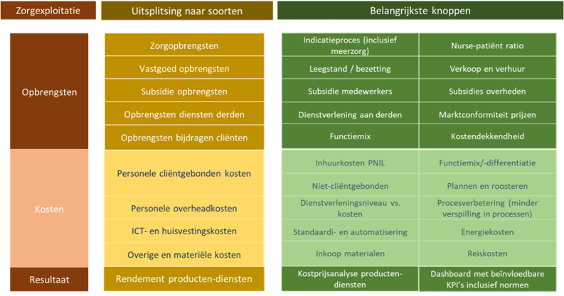 Het stappenplan is gebaseerd op een denkkader dat Berenschot ontwikkelde mede op basis van inzichten uit de Benchmark Care (zie figuur). Daarin is te zien via welke 'knoppen' zorgorganisaties hun opbrengsten en kosten kunnen beïnvloeden.